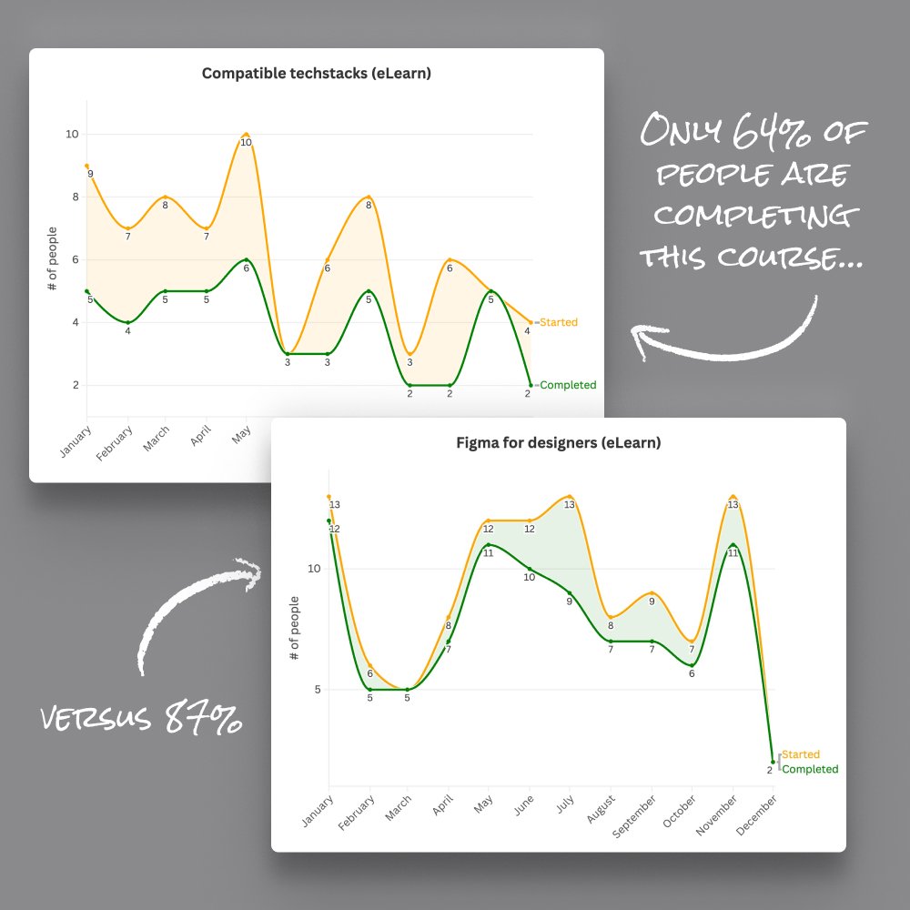 Created a clear picture of how the design system trainings were performing by pulling and organizing the data, coming up with a process to report monthly, and showed that overall, 92% of the people who started online trainings also finished them.